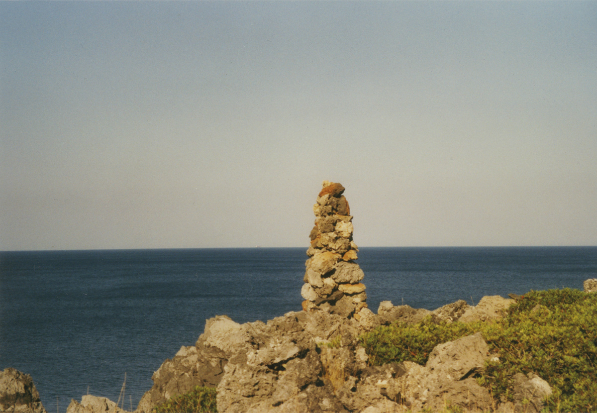 The towers can be seen from a distance of about two kilometers. They are reminiscent of both the old, decaying stone buildings on the island and cairns, man-made piles of stone, often used to mark a path. This path is purely visual: it leads from the sea up the hill, but is hardly reachable.